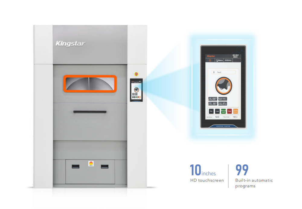 ❑ Szárítási programok: A programokat tekintve a Kingstar 100 kg szárító 10 hüvelykes színes érintőképernyőt használ, amely 99 szárítóprogram tárolására képes. Az egyes programok paraméterei is módosíthatók. Szárításkor a szárító három üzemmódú szabályozást használ: idő, hőmérséklet és páratartalom.