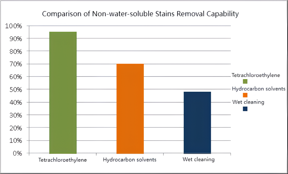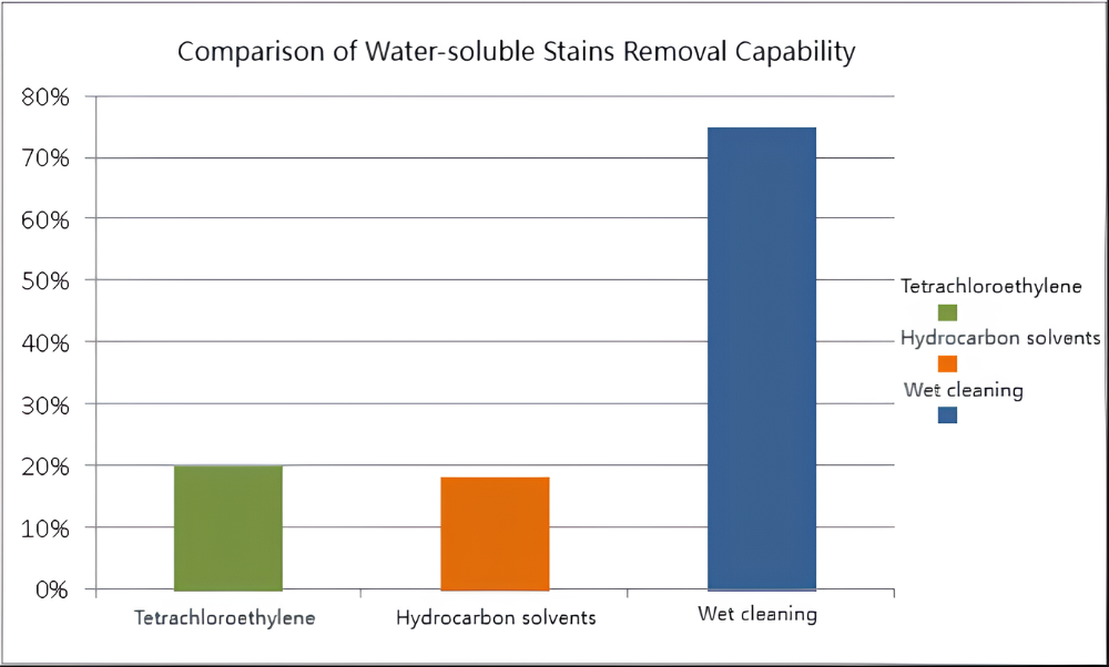 A vízben oldódó foltok eltávolítására a nedves tisztítás rendelkezik a legerősebben, ez elérheti a 75%-ot is, ezt követi a tetraklór-etilén és a szénhidrogén oldószerek.